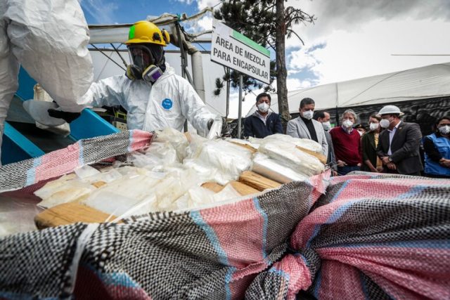 Le autorità ecuadoriane hanno proceduto alla distruzione di 21,5 tonnellate di cocaina rinvenute giorni fa nel magazzino sotterraneo di una piantagione di banane di Vinces, nella provincia costiera centrale di Los Ríos.