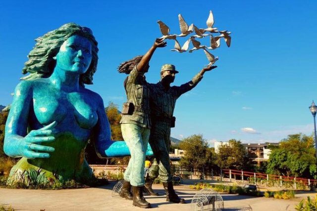 Il gruppo scultoreo in bronzo era composto dalla figura di una donna nuda a partire dalla vita in su, alta 12 metri, e da quelle, alte sette metri, di un soldato e di una guerrigliera impegnati a lanciare verso il cielo alcune colombe.