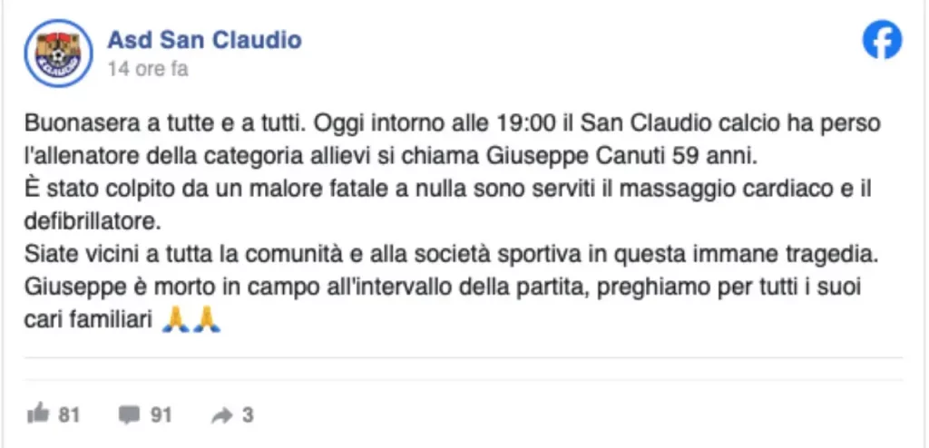 La notizia della morte ha colpito profondamente la comunità di San Claudio e l’intero territorio. La società sportiva ha espresso il proprio cordoglio attraverso un messaggio pubblicato sui social. “Siate vicini a tutta la comunità e alla società sportiva in questa immane tragedia”, si legge nella nota diffusa dall’Asd San Claudio. Il dolore è condiviso da atleti, famiglie e dirigenti. L’intero ambiente calcistico si è stretto attorno alla famiglia.