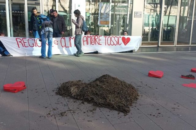 Un cuore di letame davanti all’ingresso del Pirellone, sede del Consiglio regionale della Lombardia, e uno striscione con scritto: ‘Regione e clima: amore tossico’.