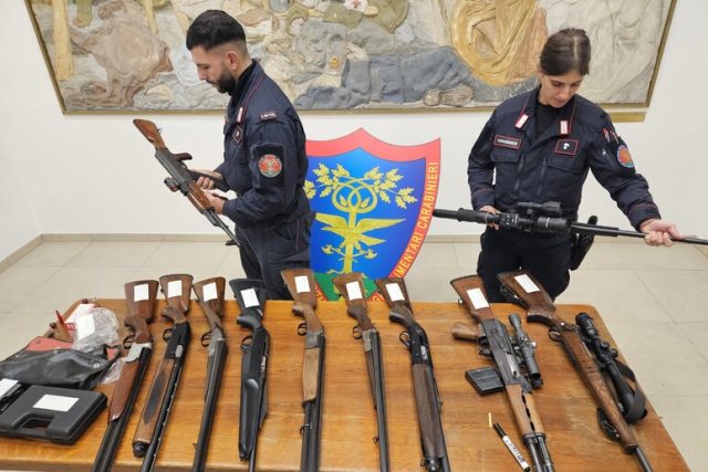 Le carcasse trovate erano soprattutto di ungulati maschi, con evidenti segni che riconducevano l’abbattimento a colpi di arma da fuoco e avvenuto per tutti i capi in breve tempo, senza prelevare parti per procurarsi carne o trofei. Gli accertamenti hanno condotto a indagare un agricoltore privo di licenza di caccia e, ispezionati gli animali, sono state estratte le munizioni per confrontarle poi con eventuali armi in possesso dell’uomo. Dall’agricoltore i carabinieri hanno trovato dodici armi a canna lunga detenute per uso sportivo, una pistola, coltelli da caccia, numerose munizioni, un trofeo di cervo, puntatori e ottiche di precisione e un laccio metallico. Sono stati sequestrati anche i dispositivi informatici per le successive analisi forensi.