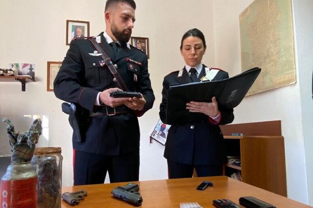 Un allevatore nuorese di 65 anni è stato arrestato dai carabinieri della Compagnia di Tonara, supportati dai militari dello Squadrone Eliportato Cacciatori di Abbasanta e ora si trova rinchiuso nel carcere di Oristano a disposizione dell’autorità giudiziaria.  In alcuni edifici rurali aveva nascosto due pistole di piccolo calibro, delle quali una in cattivo stato di conservazione con matricola illeggibile e una, di fabbricazione belga, con canna modificata, una pistola a salve, tre bombe a mano modello “Srcm” usate dalle Forze Armate nazionali e un cospicuo numero di munizioni di vario calibro. Inoltre, è stato rinvenuto anche un significativo quantitativo di materiale esplosivo del peso complessivo di circa 800 grammi, costituito da 4 candelotti di dinamite e 4 spezzoni di gelatina da cava.