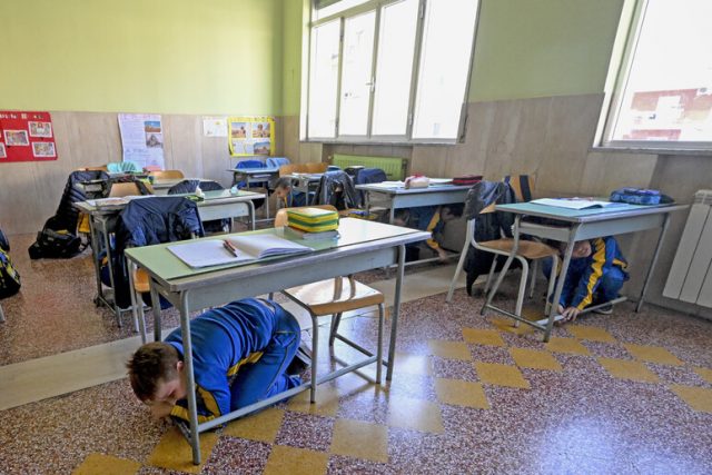 ‘Tutti giù per terra’. Prove di sisma come in un gioco alla scuola San Giuseppe di Pozzuoli dove, al convenuto suono della campanella, seguito dall’annuncio di suor Rita, tutti i bambini della scuola elementare, già addestrati da decine di scosse già affrontate negli ultimi mesi, si riparano prima giù sotto i banchi per poi, passata la scossa, raggiungere in fila e con percorsi collaudati l’ampio cortile.