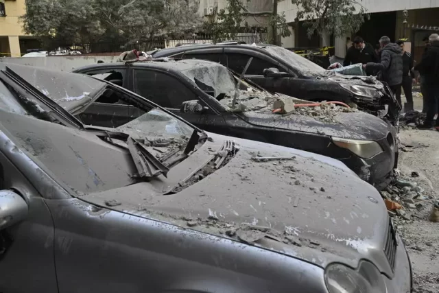 Foto diffuse sui media mostrano un appartamento al quarto piano di un edificio distrutto e in fiamme, con danni estesi anche agli edifici vicini, a botteghe e automobili parcheggiate in un quartiere densamente popolato di Sidone.